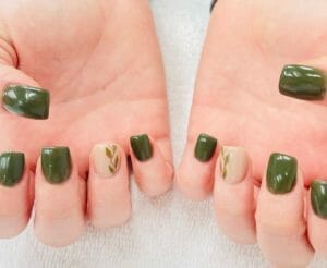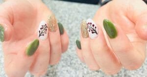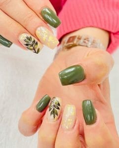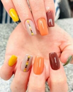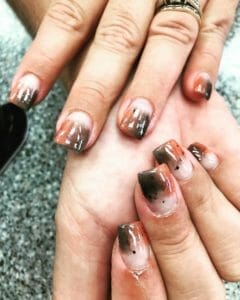 Dit zijn nagels in de echte herfstkleuren. Prachtig als in de herfst de bossen in deze kleuren veranderen, dus waarom niet deze prachtige kleuren op je nagels gebruiken? Goud past goed bij de warme kleuren, dus als je een extra accent aan de nagels wilt geven kun je daar goud goed voor gebruiken.