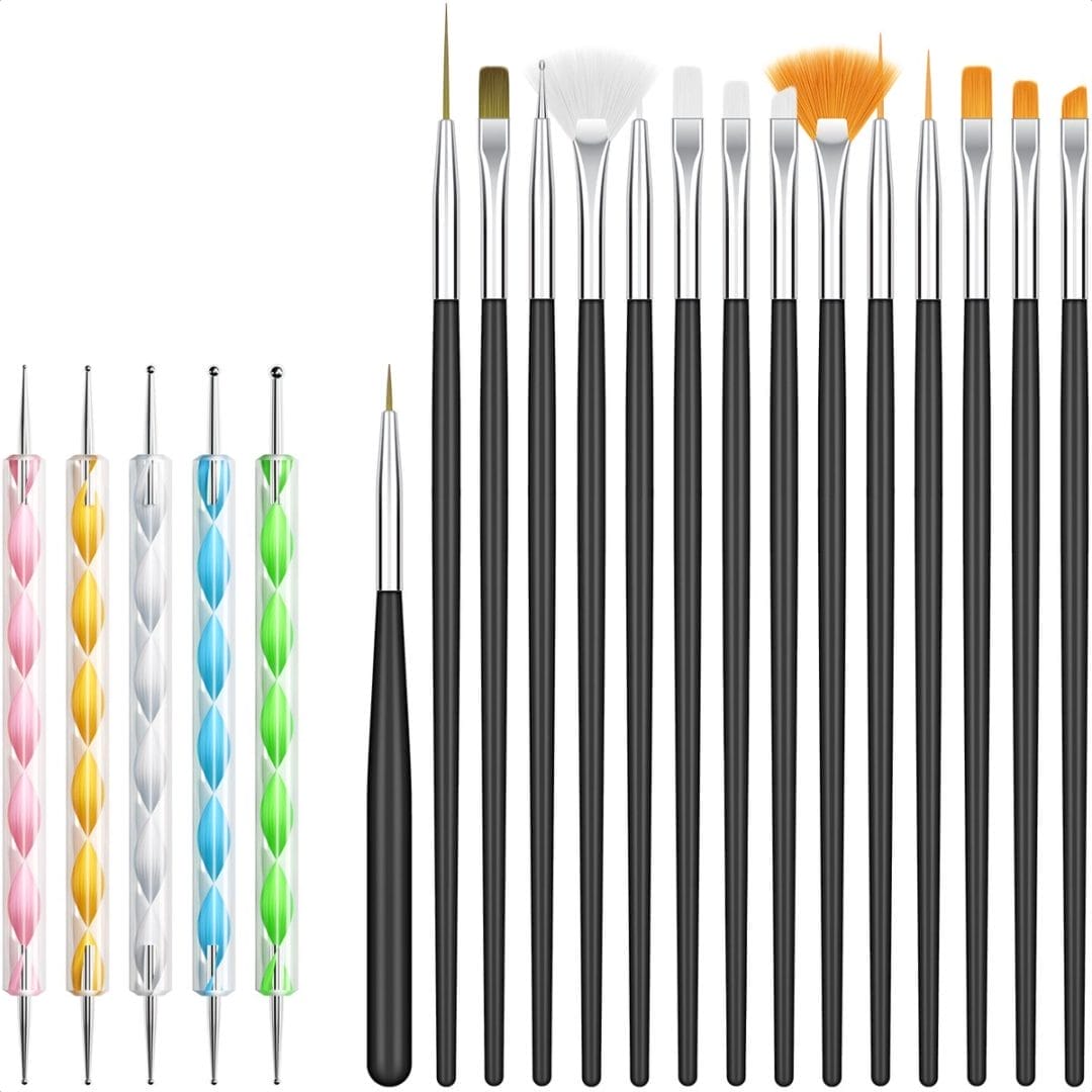 Gek op nagellak? Maak jij er ware kunstwerkjes van? Met deze Evvie© set van 15 verschillende nail art penselen en set van 5 dotting tools teken je in een handomdraai de mooiste patronen op je nagels. Van stip tot streep, van marmer tot bloemmotief, jouw nagels zien er nooit meer saai uit!