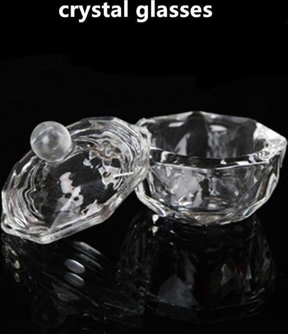 Glazen dappenglaasje / dappendish voor acryl liquide (monomeer, vloeistof) en andere vloeistoffen, zoals, penseelreiniger, nagellak remover, desinfectans. Met handige deksel om de kostbare vloeistoffen niet te laten verdampen en beschermen voor contaminatie met andere nagelproducten of vijlstof.