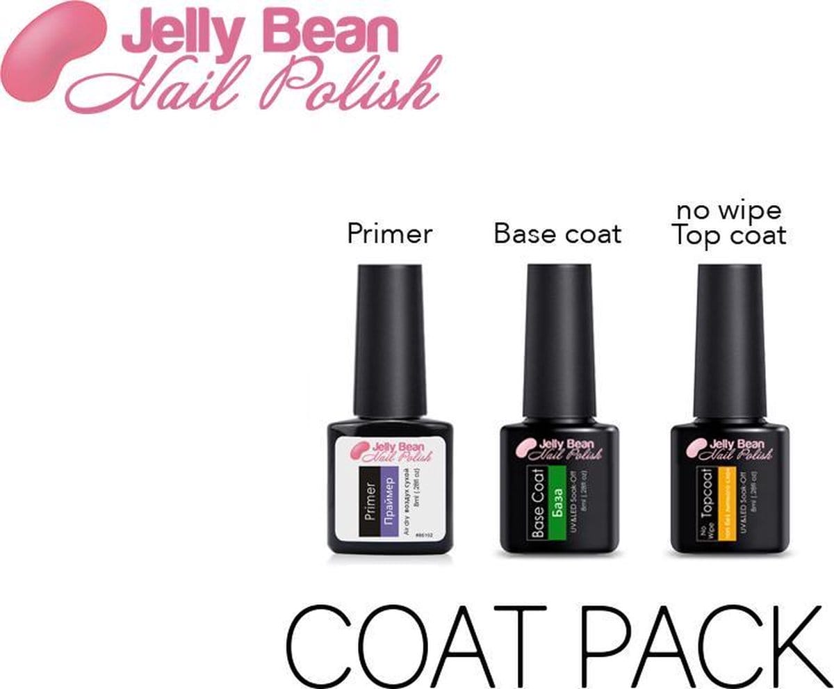 Deze set bevat de essentials van Jelly Bean Nail Polish: primer, base coat en glossy topcoat.