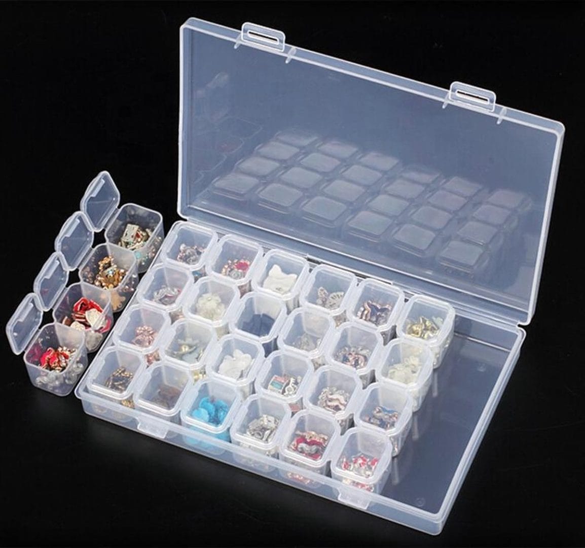 Opbergdoosje 28 vakjes Diamond Painting Opbergdoos 28 bakjes. Ieder bakje kan afzonderlijk van elkaar geopend worden. De bakjes zitten met vieren aan elkaar vast. Hierdoor zullen je steentjes nooit meer door elkaar gaan.