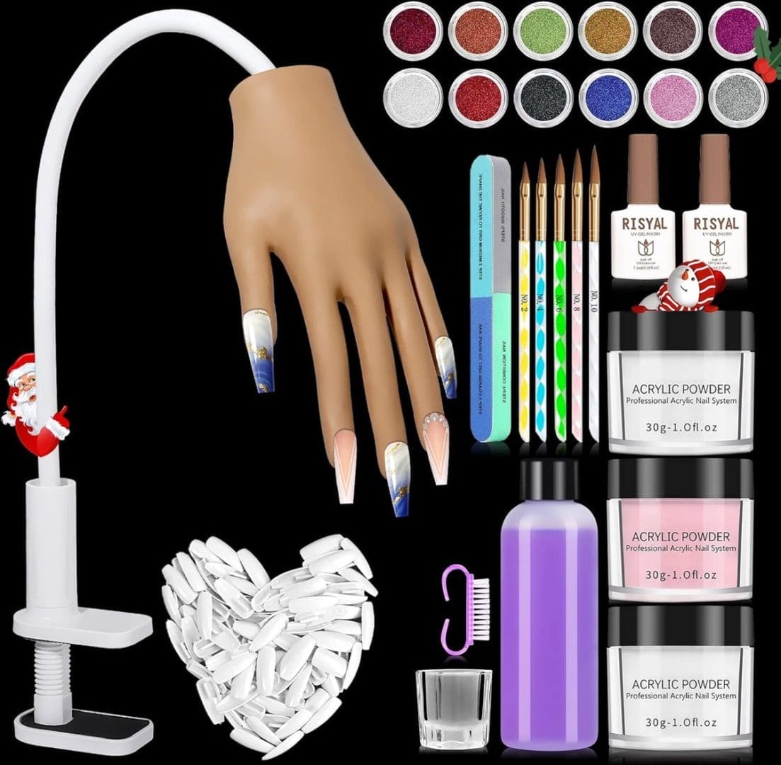 Inhoud: 1x Oefenhand, 30g acrylpoeder, 12 kleuren glitterpoeder, 100 stuks kunstnagels, 5 nagelpenselen, en andere basis nail art tools.