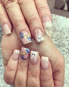 Hoe leuk zijn deze haasjes op de nagels! Met deze gelnagels voor pasen zie je er op zijn paasbest uit en weet je zeker dat je nagels bij de pasen passen! De derde foto is heel opvallend, maar foto’s 1 en 2 zijn wat neutraler. Je kunt dus gelnagels voor pasen hebben die opvallend zijn of wat neutraler.
