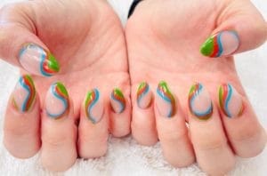 Je kunt de nagels neutraal houden qua kleur en fijne swirls maken, dat bij bij de minimal nagel trend. Maar je kunt het ook drama maken door kleuren te gebruiken en brede swirls.